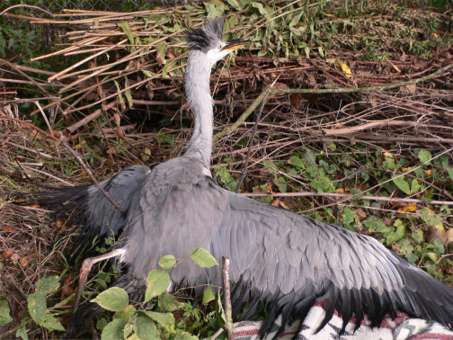 05.10.10: Anruf von der Tierklinik Stohler + Partner, Biel-Benken. "Danae, wir haben wieder mal ein Vogelproblem. Lange Beine, langer Schnabel, grau = Graureiher". Super... Jemand hatte ihn gebracht, er war wohl einem Gestrüpp hängen geblieben und der Verdacht auf ein gebrochenes Bein bestand. Allerdings, so ganz genau hatte ihn noch niemand angeschaut. Ich nach Feierabend also hin, unter einer Plane in einer Kiste lag er... Handschuhe an, Schnabel fixiert, der Vogel fauchte und zeterte los. Unglaublich, was so ein wütender Reiher für ein Tonrepertoir zum Besten geben kann. Bald stellte sich heraus, dass der arme Kerl wohl nass und verklebt aber grösstenteils unverletzt ist (leichte Schürfungen an den Beinen, Kratzer). Sehr geschwächt, dies allemal.