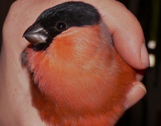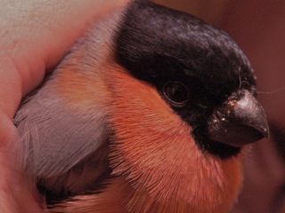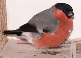 15.12.10: Die Dame rief abends an und erzählte von einem Vogel, sie vermute ein Gimpel. Der Sohn fand ihn auf dem Heimweg am Boden sitzend. Später abends brachte sie ihn mir nach Muttenz, er atmete teils schwer, das hatte er bei der Dame schon gemacht.
