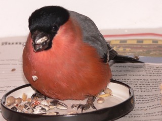 16.12.10: der Gimpel war abends, als ich nach hause kam, quietschfidel, hüpfte munter auf den unteren Aesten herum und hatte auch einiges an Körnern gefressen. Allerdings stimmt schon etwas nicht mit ihm, er versuchte dann auf die oberen Aeste zu gelangen, dies schaffte er aber nicht, stürzte immer wieder ab. Ich habe den Eindruck, er ist ein bisschen schief.... Vielleicht braucht er einen Schiropraktiker?! Ich denke, er ist wohl irgendwo reingeflogen und braucht nun ein paar Tage um sich zu regenerieren. Aber munter ist er auf jeden Fall.