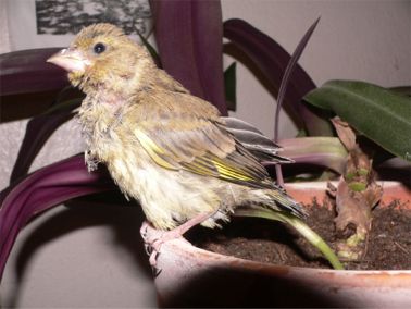 17.08.10: gestern abend habe ich den Entschluss gefasst, den kleinen Grünfink an Sandra abzugeben. Sie hat ein ganzes Zimmer eingerichtet für ihre Kanarienvögel, die können sich dort frei bewegen, haben diverse Futterstellen, Sandbäder, Wasserbäder und viele Bäume und Aeste zum Sitzen. Da der Grünfink ziemlich nahe verwandt ist mit den Kanarienvögeln, haben sie natürlich ähnliche Verhaltensweisen und ernähren sich auch fast gleich. So kann der Grünfink von den Kanaris nun viel lernen und sobald er gut fliegen und alleine fressen kann, wird Sandra ihn auswildern.