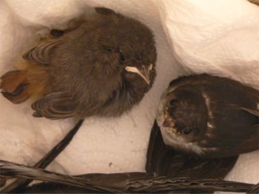 Eine Mehlschwalbe, sie ist eigentlich so gut wie erwachsen, fliegt aber noch nicht richtig und ist auch ziemlich scheu. Inzwischen muss sie aber nicht mehr zwangsgefüttert werden sondern pickt von der Pinzette. Auch sie war bei 7 vor 7 zu sehen, bei der Fütterung. Ich denke, die kleine kann bald raus....