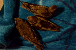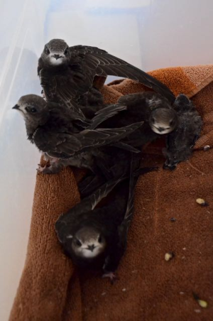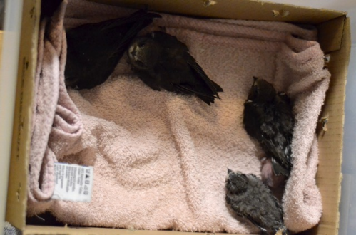 29.06.2018: 3 Segler, abgegeben und dann  leider, zwar gut gemeint aber völlig auf die falsche Art versucht zu füttern, kamen zu Huong und danach zu mir. Alle 3 leider in einem sehr schlechten Zustand, Federn total verklebt und anfangs auch sehr traumatisiert. Inzwischen sind sie halbwegs sauber, fressen besser und nehmen langsam zu.