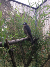 20.06.2018: Der immer noch namenlose Wanderfalke (Name müsste mit B sein), ist extrem scheu und wild geworden, fliegt inzwischen 1a durch die 14 m lange Voliere, macht dann aber, trotz Bambusmatten, leider dies, was diese Vögel gerne machen: er knallt voll Karacho ins Netz. Dabei verletzt er sich auch am Schnabel. Da Ben, der Falkner, die nächsten Wochen beruflich sehr engagiert ist und definitiv keine Zeit haben wird, den Burschen zu trainieren, steht nun der Entscheid, den Falken doch auszuwildern. Er wird von uns jetzt einige Tage intensiv hochgefüttert, damit er mit sehr gutem Gewicht starten kann. Er wird das Jagen lernen müssen, leider kann ich ihm nicht vorausfliegen und zeigen, wie man im Sturzflug eine Krähe holt. In der Voliere trainieren ist bei dieser Vogelart sinnlos, da sie aus grosser Höhe in der Luft angreifen. Ideal wäre die Arbeit am Federspiel gewesen, die hätte aber bedingt, dass er den Handschuh akzeptiert, auf Faust kommt, dort einigermassen entspannt ist und dann, von dort aus jagt... Ein Prozess, der Wochen dauert!