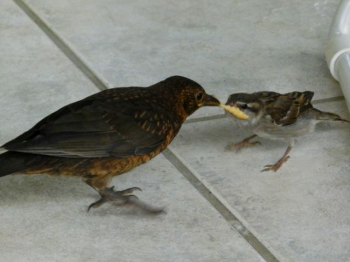 Der Jungspatz sitzt bei der Amsel, er ist sehr schreckhaft, gibt es Futter, kommt er mit weit aufgerissenem Schnabel an wie ein Geier, packt sich das Futter, dreht hysterisch um und rennt davon--er probiert es zumindest aber der hat so Panik, dass er richtig spuhlt beim Rennen und nicht vom Fleck kommt. Ein lustiger Kerl. :-)