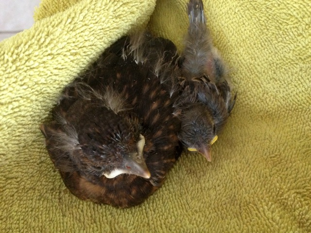 Die beiden Spatzen lagen wohl schon länger da drin, waren sehr unterkühlt, der eine mehr tot als lebend.