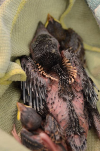 20.08.2015: es ist ruhig geworden. Die Spiren sind schon seit einigen Wochen weg, erstaunlicherweise haben einige ihre Jungen sogar zurückgelassen. 3 dieser Elternlosen sind nun noch bei uns in Pflege, sie entwickeln sich bisher gut und wir hoffen, dass sie in etwa 2 Wochen fliegen können.